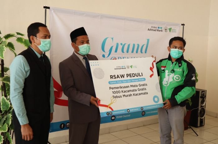 RS Mata Achmad Wardi BWI-DD secara simbolis memberikan bantuan tebus kaca mata murah bagi sejumlah kalangan, salah satunya adalah pengemudi ojek online. Selain itu, program ini juga bisa dinikmati oleh tenaga kesehatan, pelajar, santri, dan kiai. Dokumenasi RS Mata Achmad Wardi BWI-DD