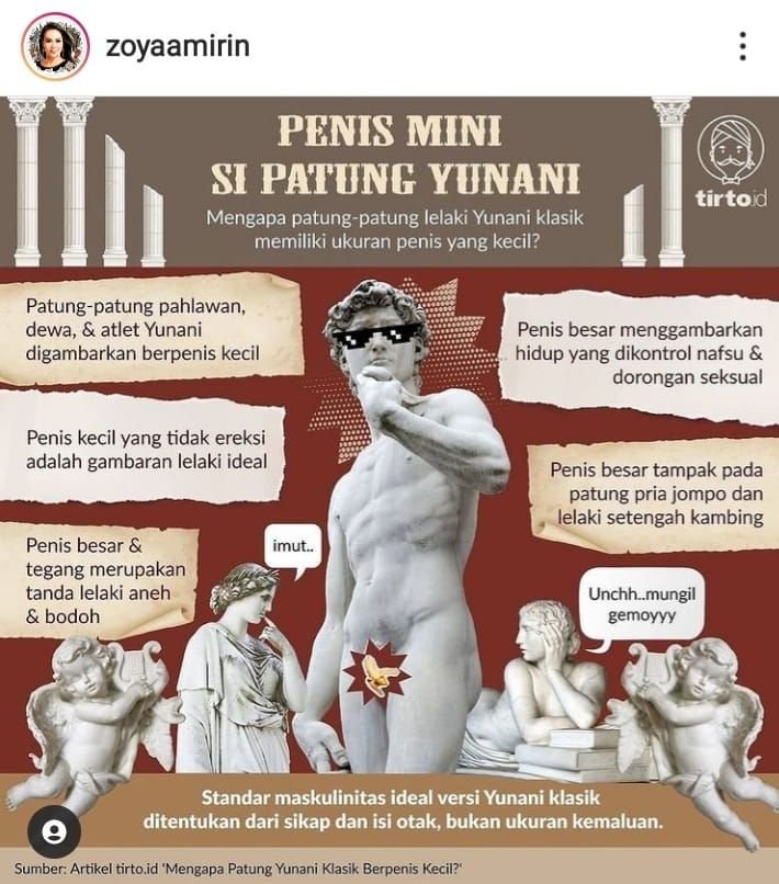 Zoya Amirin mengatakan, Lelaki Yunani klasik menganggap maskulinitas ideal diukur dari tingkat kecerdasan, kewibawaan, juga kebijaksanaannya. Bukan dari perkara selangkangan.
