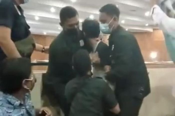 Ketua KAMMI Cilegon Ediansyah bersama beberapa rekannya digiring oleh petugas keamanan DPRD Kota Cilegon ke luar ruang persidangan, serta spanduk yang dibentangkan diamankan oleh petugas keamanan.