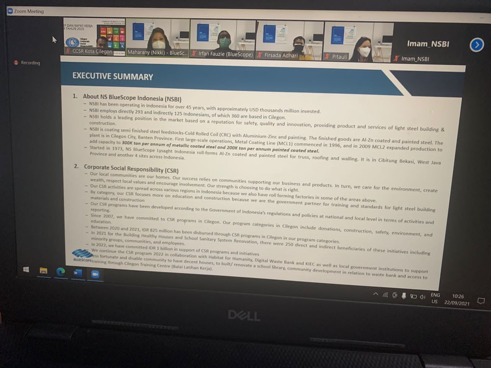 BANTENRAYA.COM- PT Bluescope Indonesia (BSI) di Kota Cilegon menyiapkan Rp1 miliar untuk dana sosial atau Corporate Social Responsibility (CSR) pada 2022 mendatang. Hal tersebut terungkap dalam acara zoom meeting Media Gathering PT Bluescope, Cilegon Corporate Social Responsibility (CCSR) dan juga awak media, Rabu 22 September 2021.