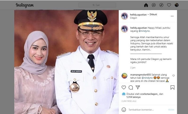 Dikutip BantenRaya.com dari instagram @helldy.agustian, Walikota Cilegon mengunggah foto anaknya Nindy bersama dirinya yang mengenakan baju dinas resmi walikota.