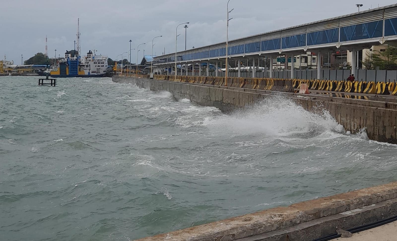 Sesekali, terjangan gelombang tinggi menghempas dermaga dan air laut naik hingga jalan-jalan di dermaga di Pelabuhan Merak.