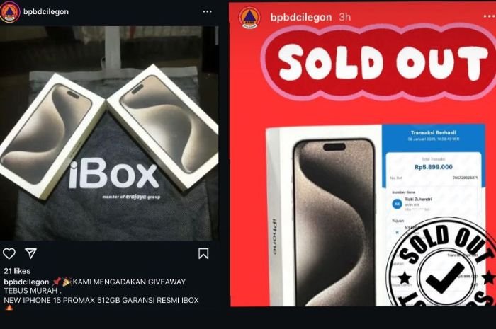 Dalam postingan akun Instagram milik BPBD Kota Cilegon pada 3 jam yang lalu, hacker melakukan giveaway tebus murah HP Iphone 15 pro max dengan memori 512 GB alih-alih garansi resmi Ibox dengan harga Rp 5,899,000 ribu.