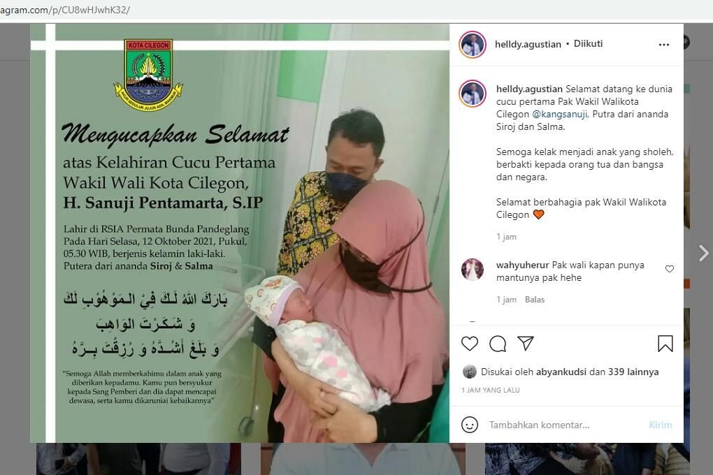 “Selamat datang ke dunia cucu pertama Pak Wakil Walikota Cilegon @kangsanuji, Putra dari ananda Siroj dan Salma,” kata Helldy di status IG.