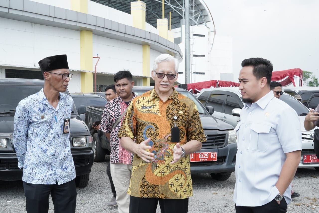 Kepala BPKPAD Cilegon Dana Sujaksani (batik kuning) bersama Walikota Cilegon Robinsar saat acara apel kendaraan dinas belum lama ini. Pemkot Cilegon siap mencairkan gaji ke-13 untuk para ASN-nya. Dokumemtasi Diskominfo Cilegon