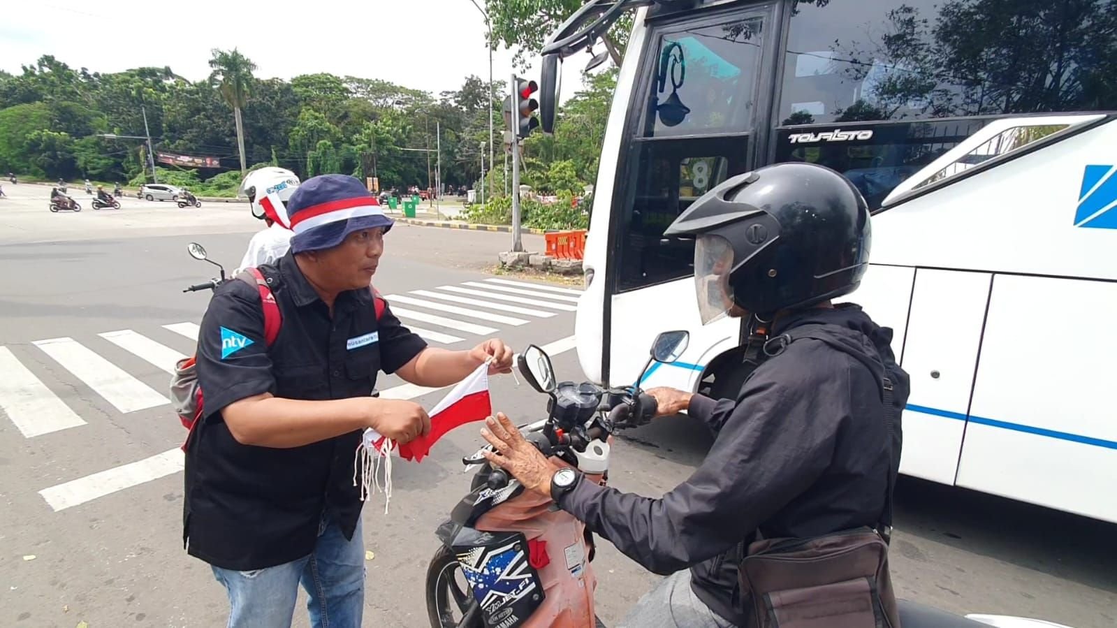 Anggota IJTI Korwil Cilegon membagikan ratusan bendera kepada pengendara yang melintas di Jalan Jenderal Sudirman, Selasa, 12 Agustus 2025. Uri/Bantenraya.com