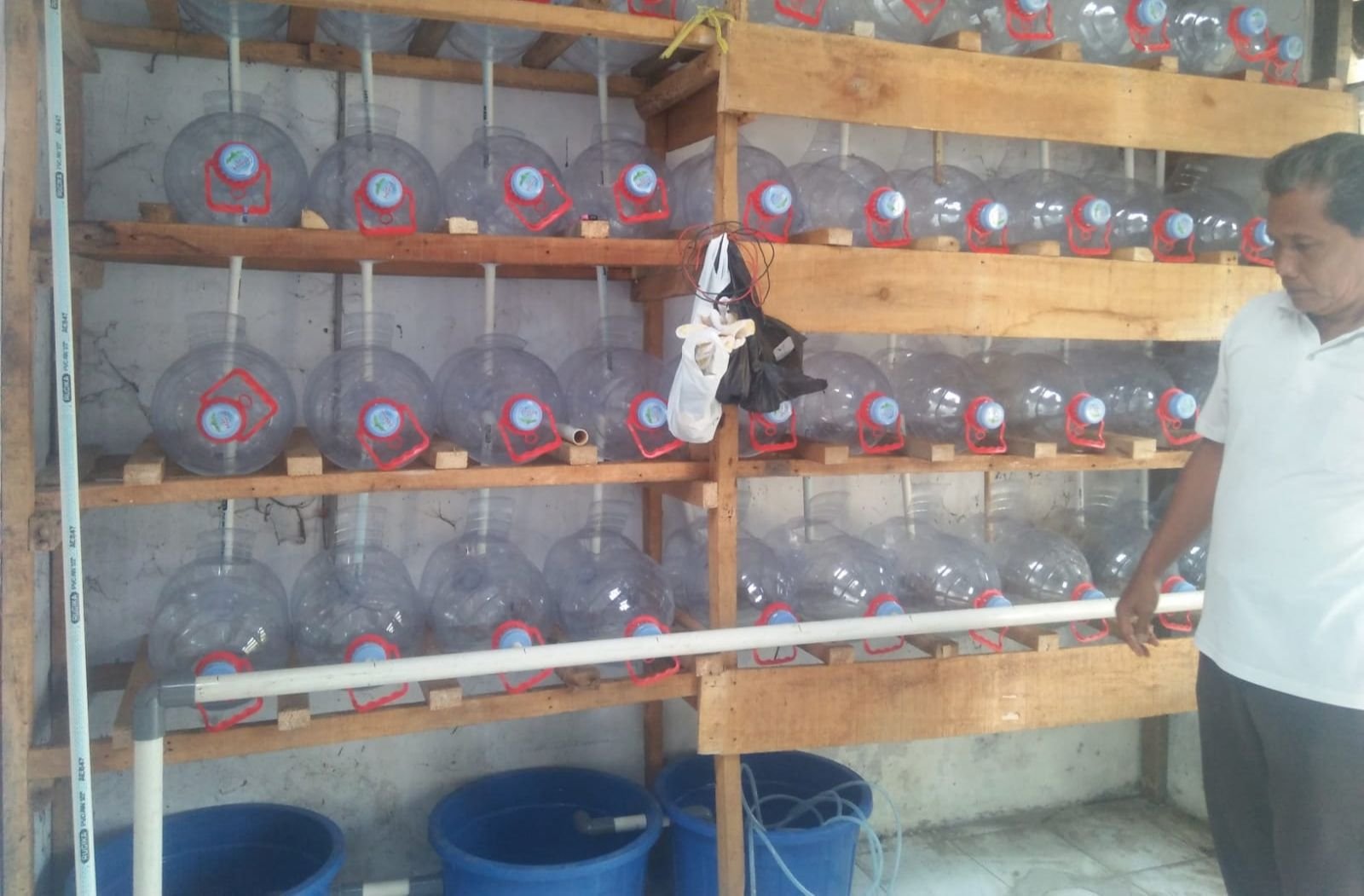 Sejumlah warga sepakat menggeluti budidaya lobster air tawar di salah satu rumah warga yang tak terpakai. Budidaya lobster air tawar ini memanfaatkan galon air mineral bekas untuk sirkulasinya.