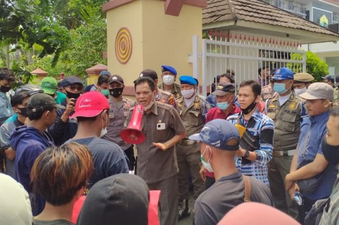 BANTENRAYA.COM – Sekda Kota Serang Nanang Saefudin menemui massa aksi aliansi Forum Komunikasi Mahasiswa Taktakan (FKMT) dan masyarakat Pasir Gadung Wadas, di depan gerbang Kantor Walikota Serang, Kamis 14 Oktober 2021.