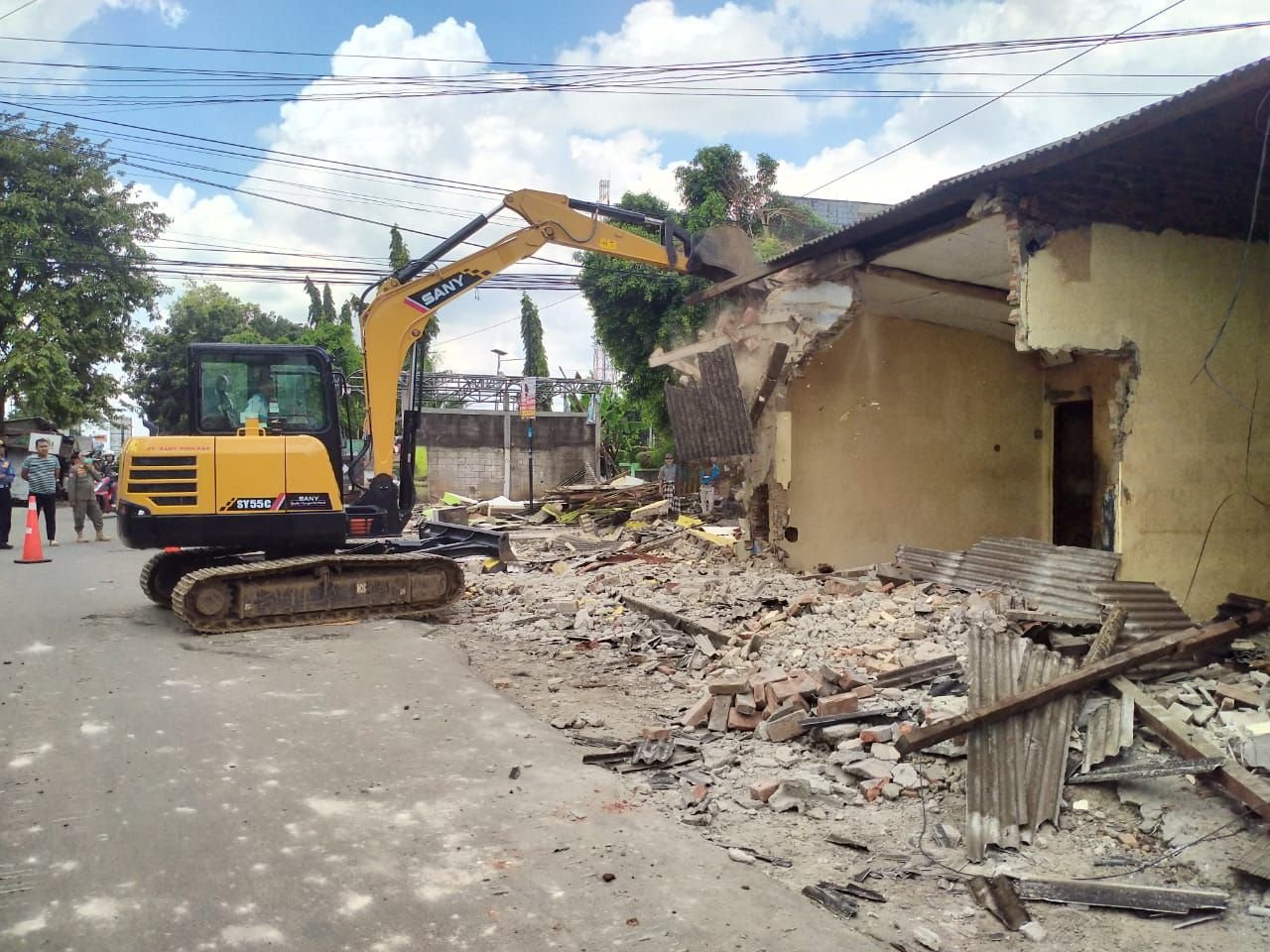 Beko membongkar bangunan liar di sempadan rel kereta api kawasan Stadion Maulana Yusuf, Kota Serang, Rabu 28 Mei 2025. Harir Baldan/Bantenraya.com