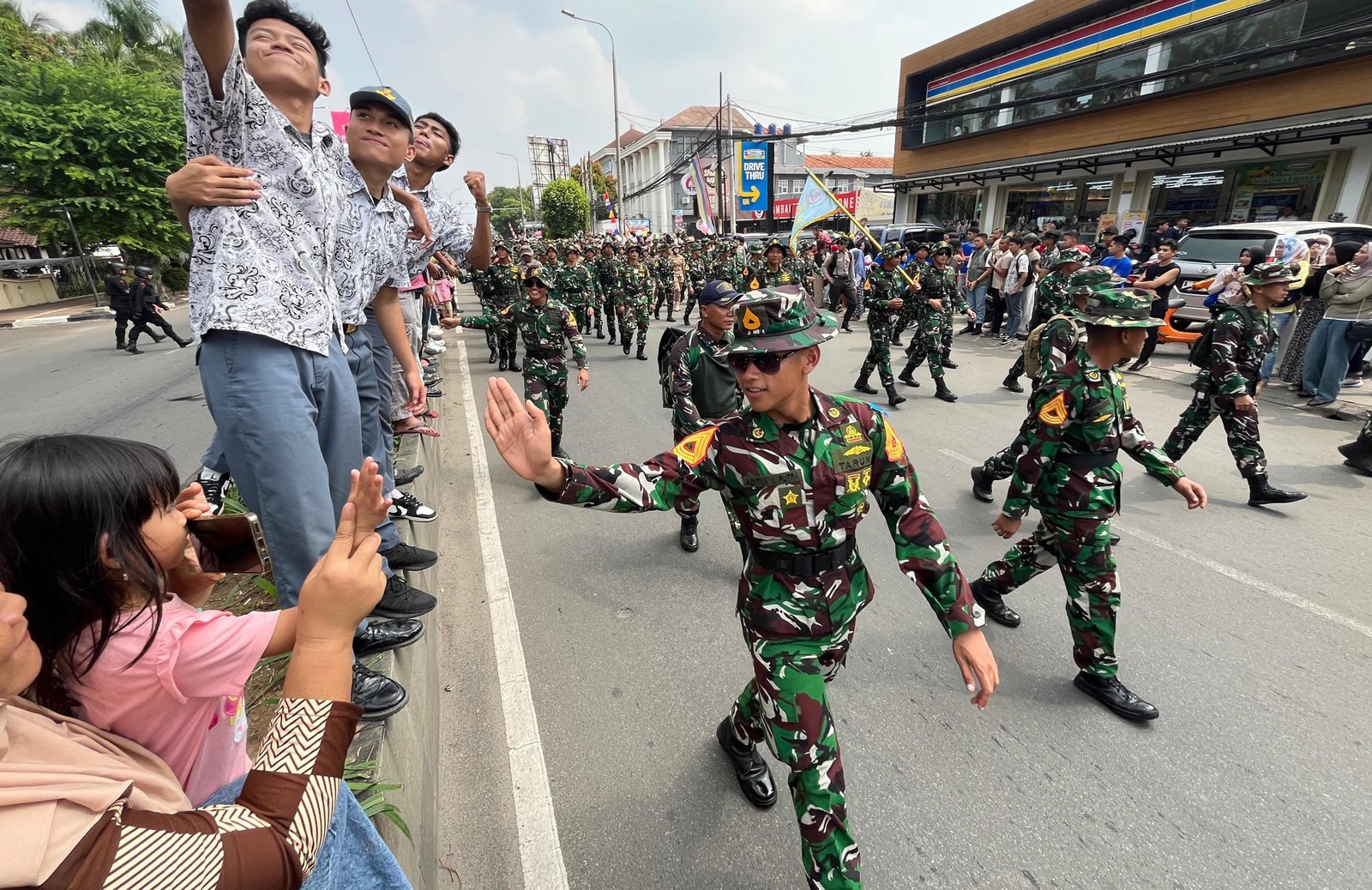 Mereka menyambut antusias rombongan kirab para taruna dari berbagai akademi militer dan kepolisian yang menjadi peserta Latsitardanus tahun ini.