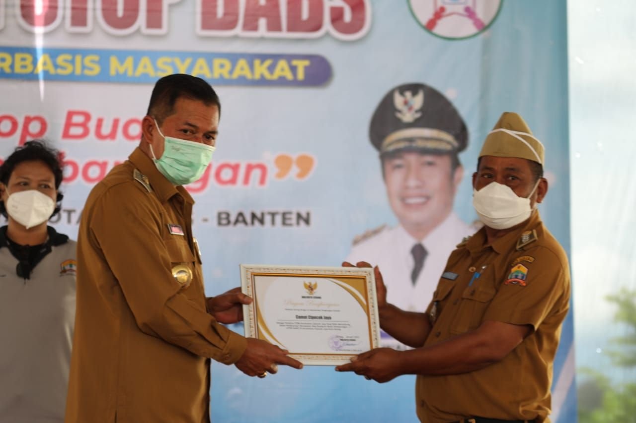Walikota Serang Syafrudin menyerahkan penghargaan kepada Camat Cipocok Jaya Tubagus Yassin lantaran wilayahnya bebas dolbon, Senin 31 Januari 2022. Foto Pemkot Serang