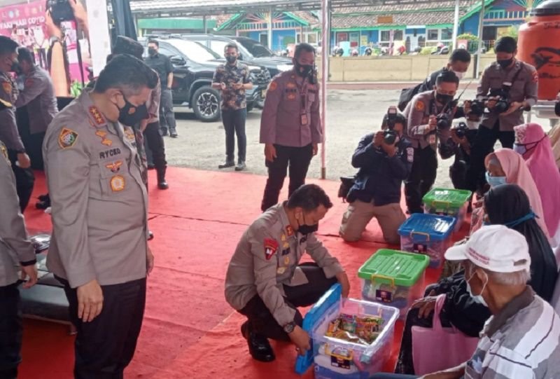Komjen Pol Rycko bersama Kapolda Banten Irjen Pol Rudy saat memberikan bantuan sembako kepada para manula yang telah divaksin dihalaman Polsek Rangkasbitung, Jumat 11 Pebruari 2022. Hudaya/Bantenraya