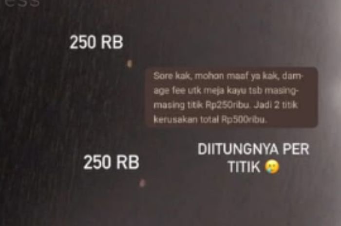 Warganet itu menyatakan bahwa ada dua lubang yang terkelupas dari meja kayu tersebut, di mana satu lubang dikenakan Rp250 ribu.