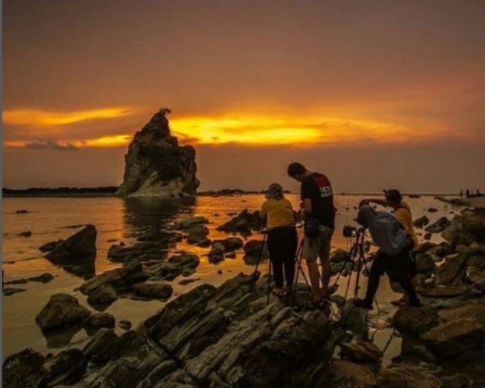 Selain itu, di Pantai ini juga terdapat batu yang berbentuk candi yang berdiri kokoh di tengah bibir pantai.