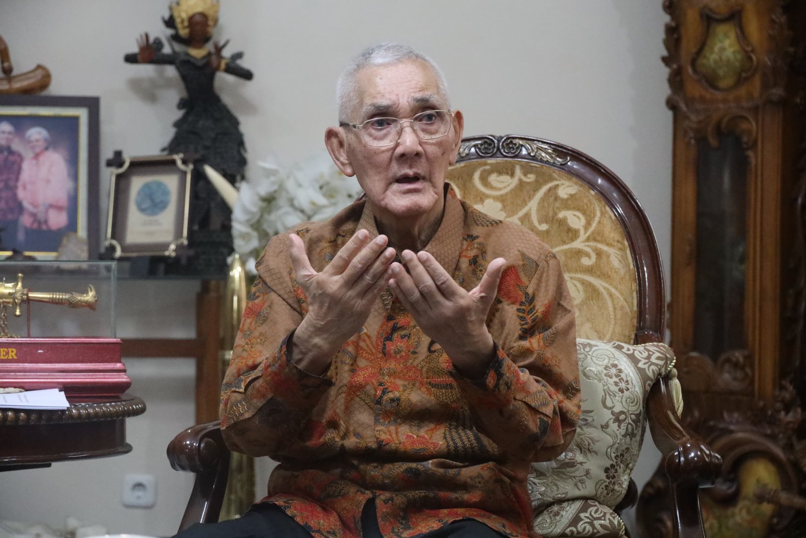 Di usia senjanya, Try Sutrisno tetap antusias mengikuti sesi wawancara dengan menuangkan pandangannya tentang Pancasila.