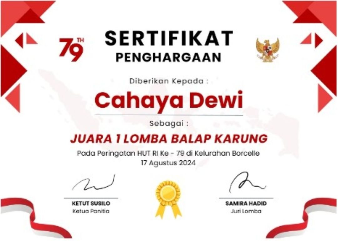 Membuat sertifikat alias piagam lomba HUT RI 17 Agustus 2024 ini sangat mudah dan bisa anda ubah dari template dalam artikel ini.