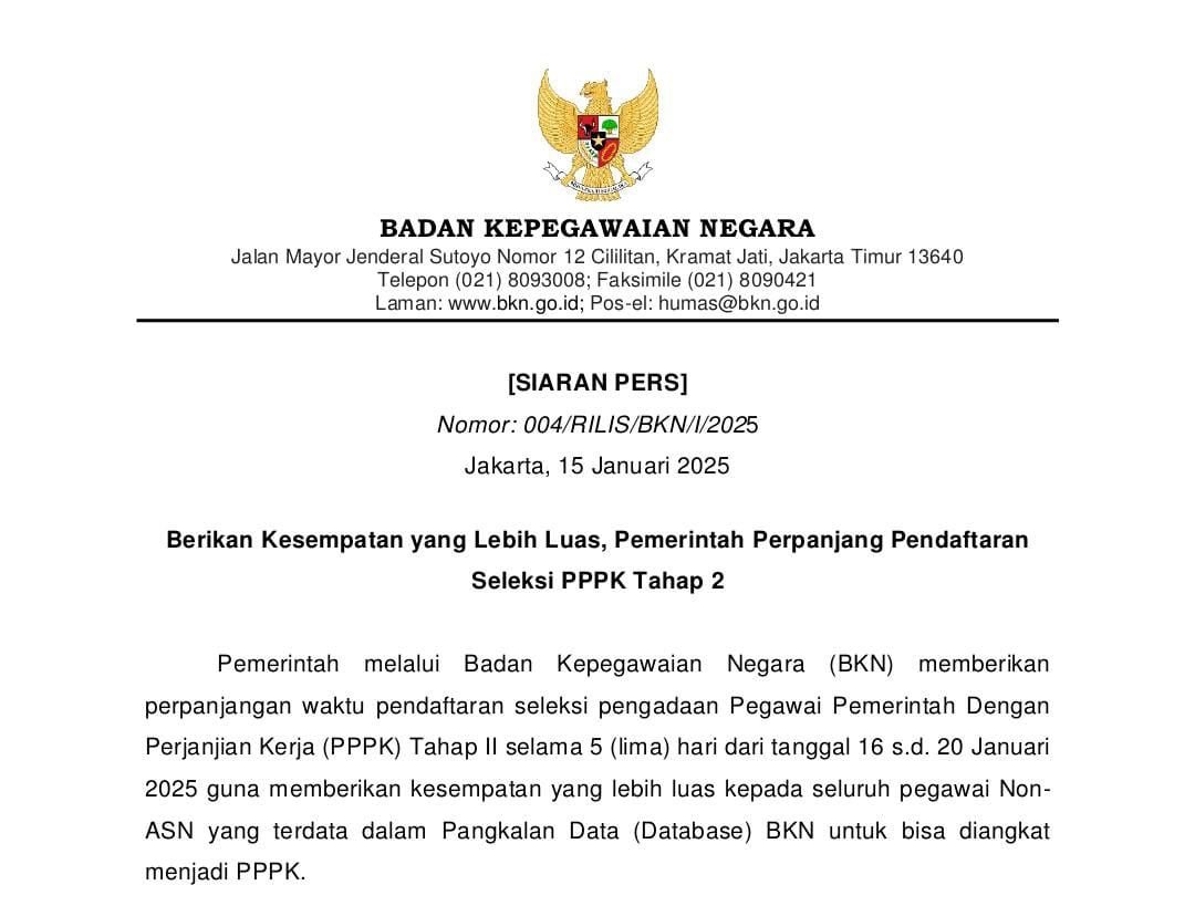 Informasi perpanjangan pendaftaran PPPK Tahap 2 ini disampaikan melalui Siaran Pers Nomor 004/RILIS/BKN/1/2025 pada 15 Januari 2025.