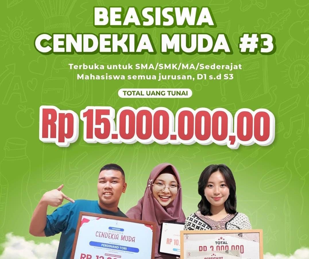 Kali ini program Beasiswa Cendekia Muda 3 dibuka untuk siswa SMA/SMK/MA Sederajat dan Mahasiswa, dari semua jurusan D1 hingga S3.