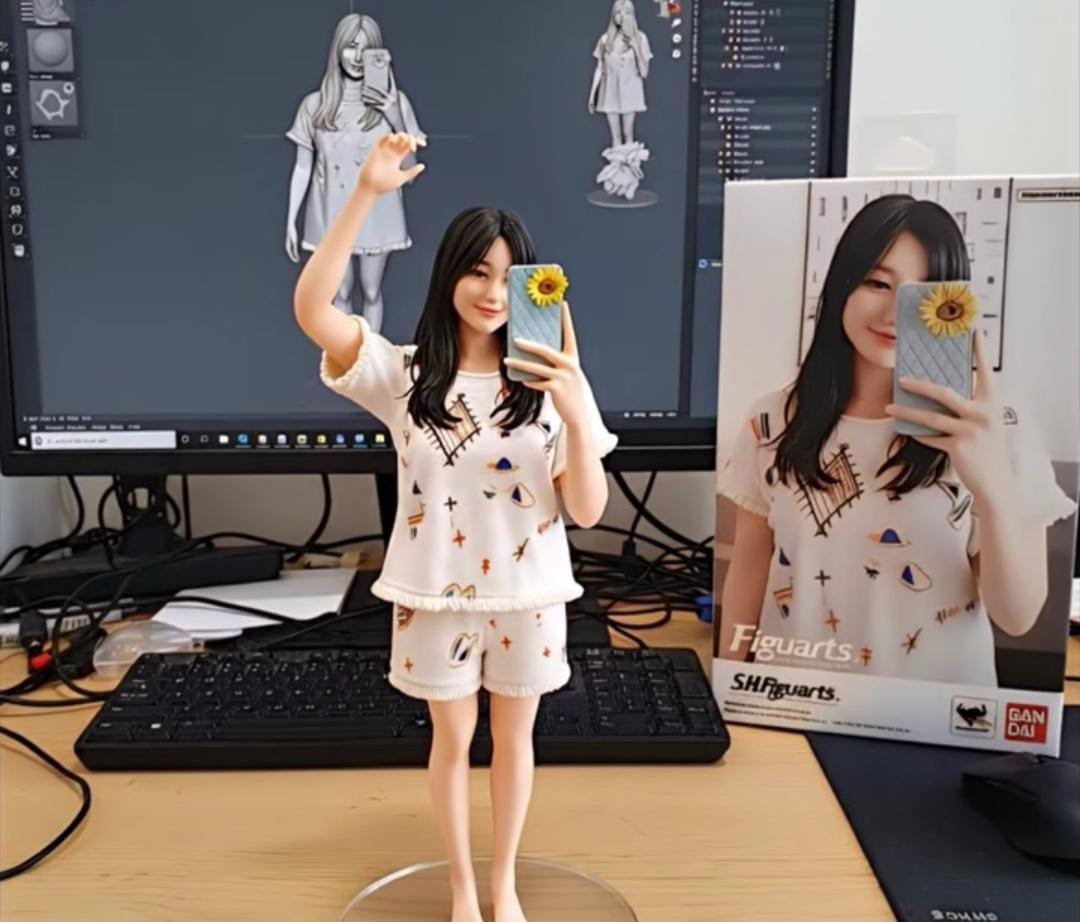 – Create a 1/8 scale commercialized figurine of the person in the selfie, realistic collectible style, placed on a computer desk. The figurine stands on a transparent acrylic base without text. On the monitor is the Cinema 4D sculpting process of the figurine. Next to the monitor is a Hot Toys-style packaging box printed with th.