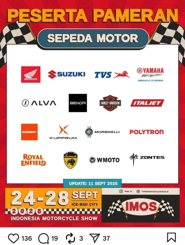 Dikutip dari Instagram @imos_id, 14 brand motor yang akan ikut meramaikan IMOS2025 adalah Honda, Yamaha, Suzuki, TVS, ALVA, Benda.