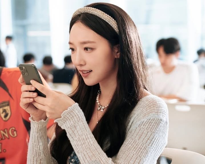 Di mana, Ahn Go Eun mengenakan gaun dan kardigan lengkap dengan bando berkilauan yang dikenakannya.
