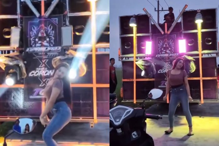 Selain itu, terlihat juga seorang bidan yang merupakan wanita pria (waria) ikut berjoget-joget di depan sound horeg.