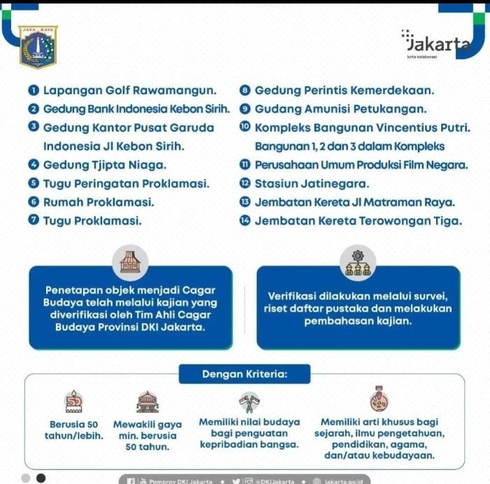 Dikutip Bantenraya.com dari laman Instagram Dinas Kebudayaan DKI Jakarta @disbuddki, Pemprov DKI Jakarta telah menetapkan 14 objek menjadi Cagar Budaya sepanjang tahun 2020/2021.