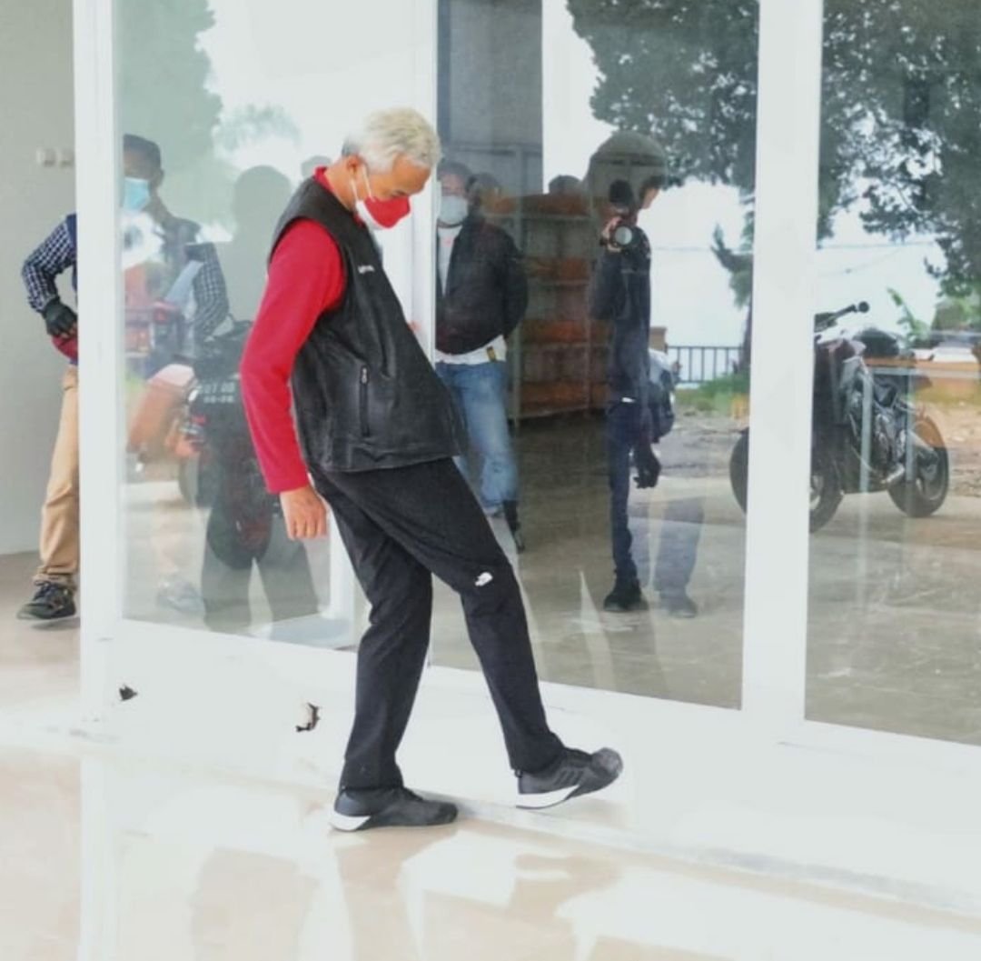 Tak hanya melihat-lihat, Ganjar juga melakukan uji kekuatan bangunan di sejumlah titik.
