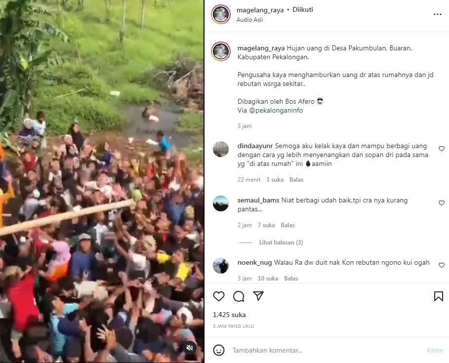 “Pengusaha kaya menghamburkan uang dari atas rumahnya dan jadi rebutan warga sekitar,” kata akun tersebut.