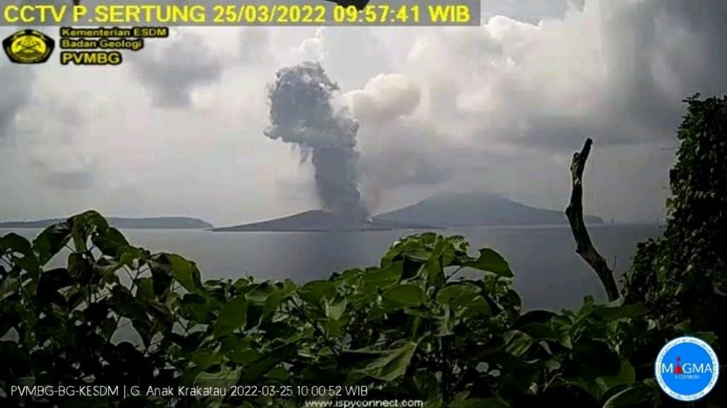 Gunung Anak Krakatau (GAK) di Selat Sunda, Lampung Selatan terus mengeluarkan asap berwarna kelabu hingga hitam, Jumat 25 Maret 2022. KESDM, Badan Geologi, PVMBG Pos Pengamatan Gunung Api Anak Krakatau