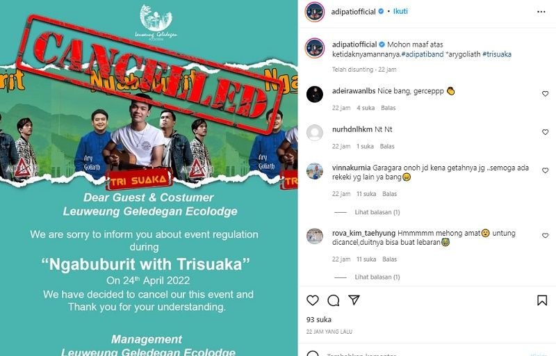 “Kami minta maaf untuk menginformasikan perihal acara ‘Ngabuburit with Trisuaka’ pada 24 April 2022, kami terpaksa membatalkan acara tersebut dan terima kasih atas pengertiannya,” kata pihak management dalam pernyataannya lewat Instagram @adipatiofficial.