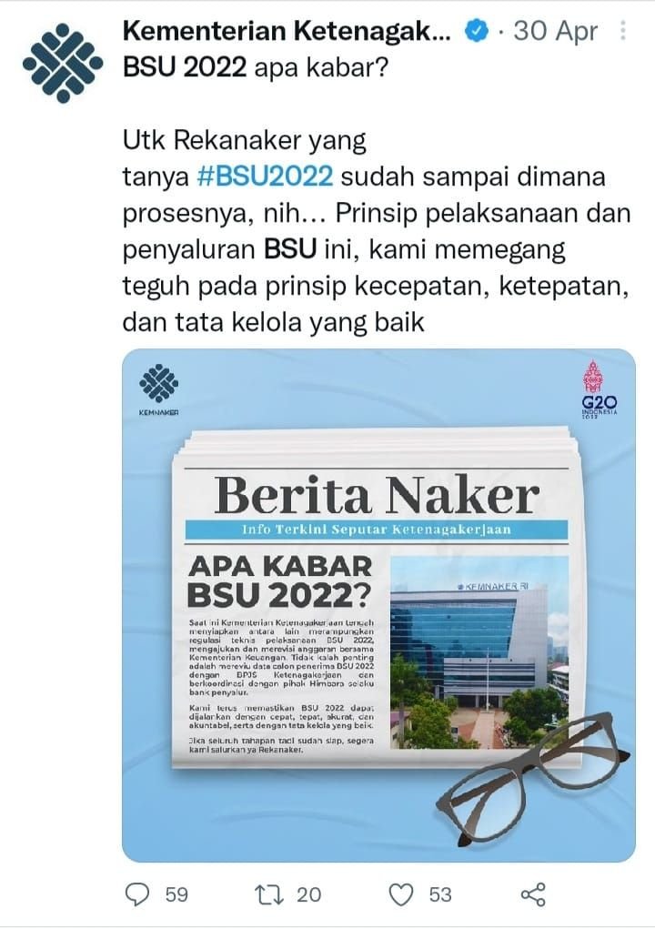 “Mudah-mudahan juga ketepatan data. Tahun lalu nama saya tercantum di data Kemnaker sebagai penerima di bank @BNI. Tapi nyatanya ke bank tersebut nama saya tidak ada,” tulisnya.