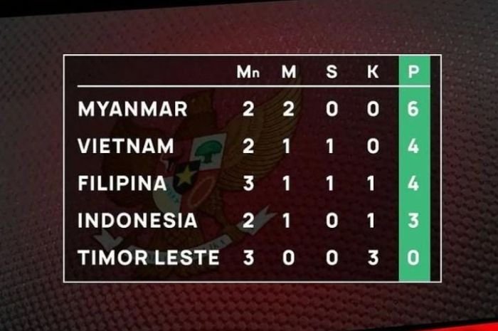 Timnas Indonesia U23 menempati posisi keempat klasemen, dengan poin 3 dari dua kali pertandingan melawan Vietnam dan Timor Leste.