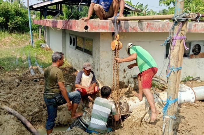 Teknisi PDAM Lebak sedang membongkar dresser joint yang pecah di IPA PDAM Lebak, Jumat 27 Mei 2022. Hudaya/Bantenraya.com