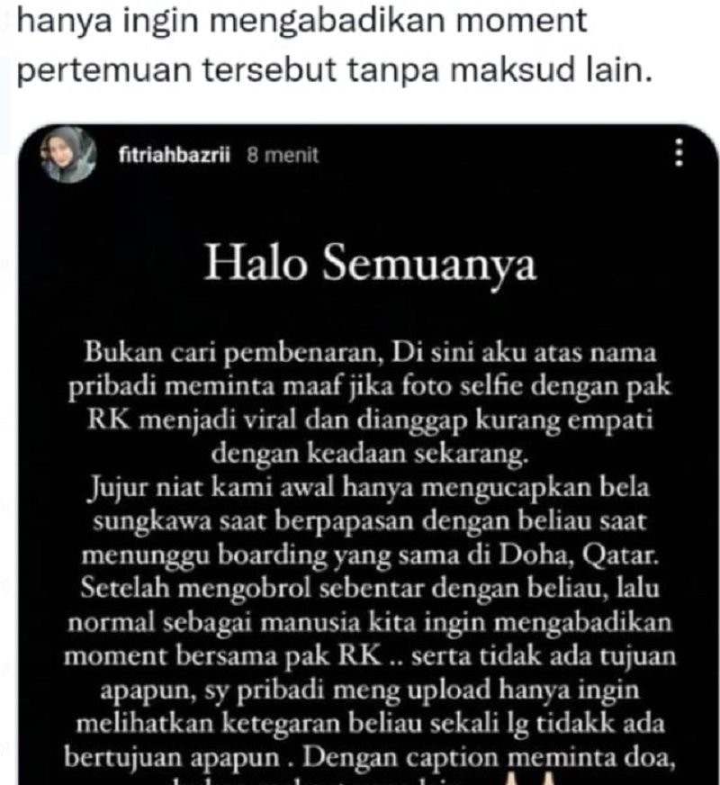 “Halo semuanya. Bukan cari pembenaran. Di sini aku atas nama pribadi meminta maaf jika foto selfie dengan Pak RK menjadi viral dan dianggap kurang empati dengan keadaan sekarang,” tulis Fitriah Bazrii ditwitter pribadinya, Fitriah Bazrii.