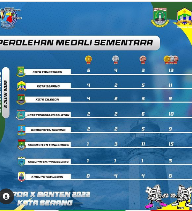 Dikutip Bantenraya.com dari akun instagram @pemkotserang berikut ini hasil Perolehan Medali Cabang Olahraga Gulat 50 Kg – 70 Kg pada Popda X Banten Kota Serang.