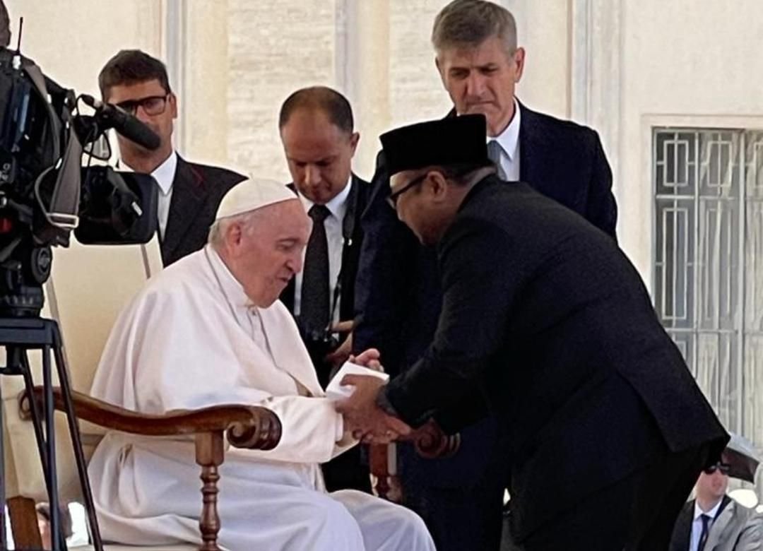Perkenankan saya memperkenalkan diri Your Holliness. Nama saya yaqut cholil, menteri agama republik indonesia. Sebagai amanat konstitusi kita, saya harus menjaga toleransi dan perdamaian antara enam agama utama dan ratusan agama lokal,” sambungnya.