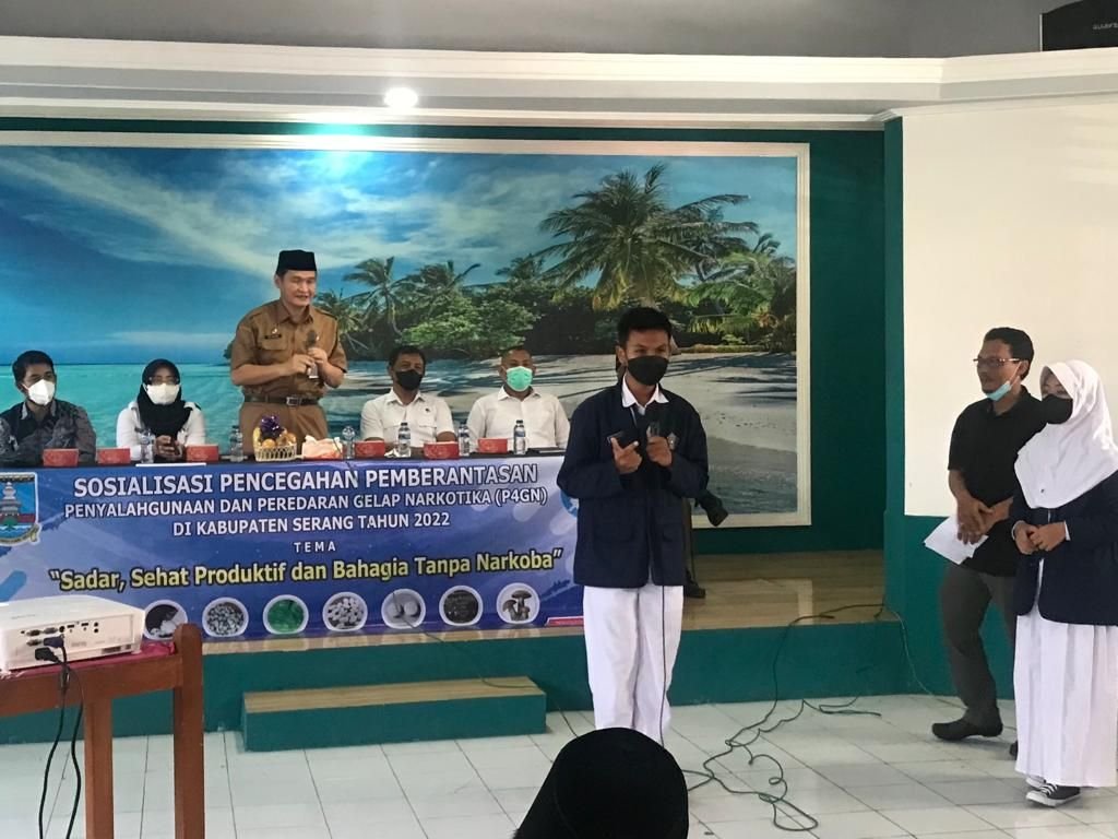 Kabid Ideologi Wawasan Kebangsaan dan Ekonomi Sosial Budaya Bakesbangpol Kabupaten Serang Lalu Farhan Nugraha menjelaskan, pihaknya mendatangkan dua orang rarasumber dalam sosialisasi P4GN yakni Muhmmad Uut Lutfi dari Fakultas Hukum Unsera dan Mita Maharani dari BNN Provinsi Banten.