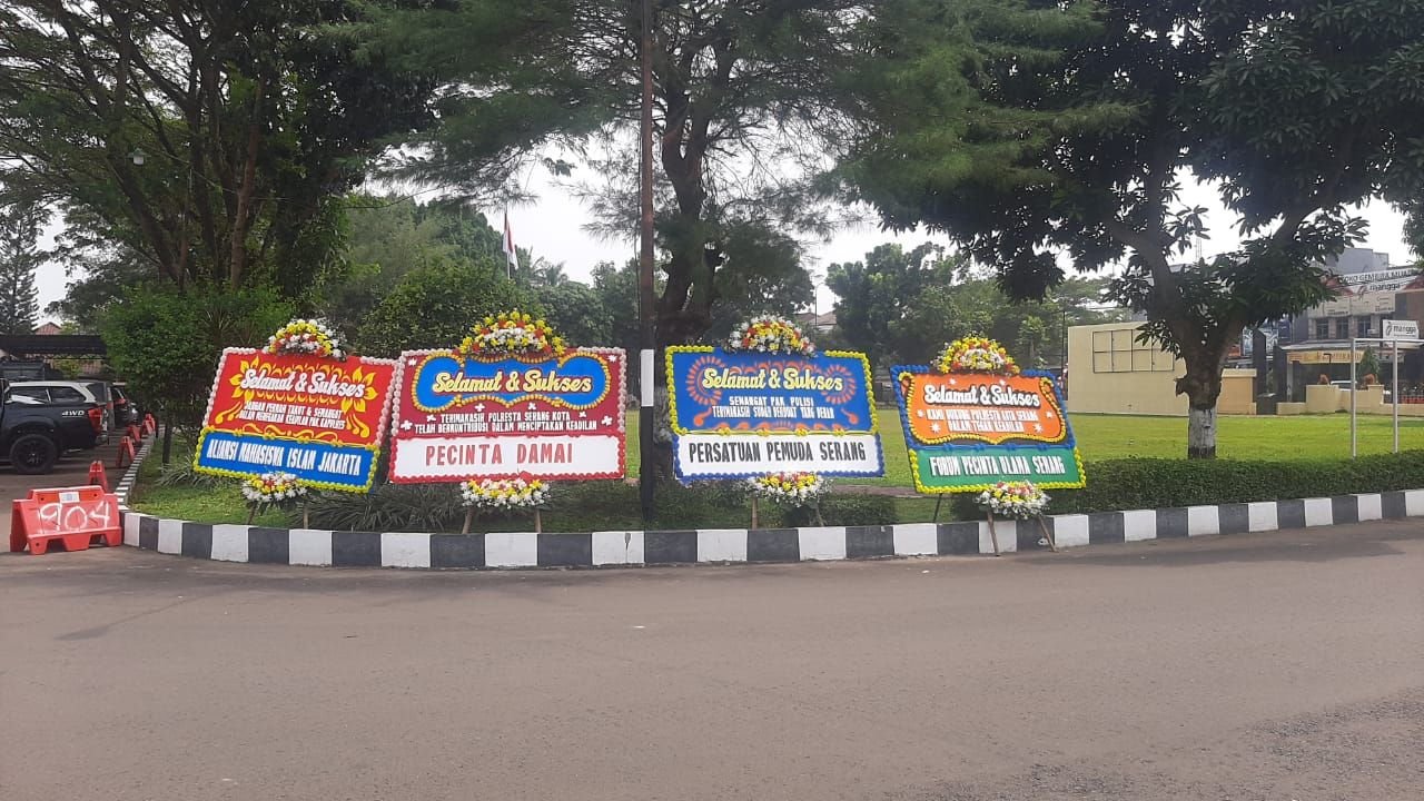 Ada berbagai ucapan karangan bunga yang dikirim untuk Kapolresta Serang Kota Kombes Pol Nugroho Arianto tersebut.