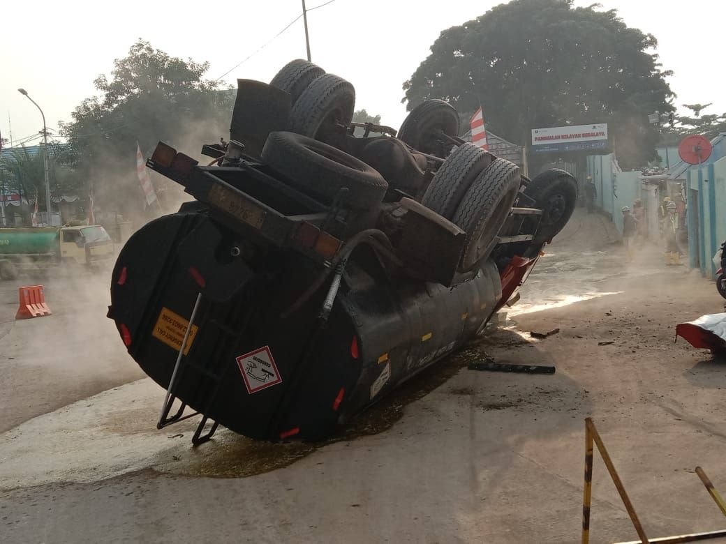 Truk yang bermuatan kimia cair terguling dan muatan tumpah di badan jalan dan bahkan mengeluarkan kepulan asap.