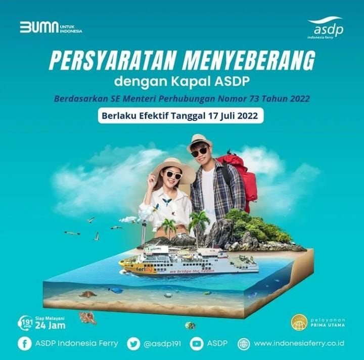Dikutif dari Instagram @asdp191, berikut persyaratan nyebrang dengan kapal ASDP sesuai Surat Edaran Kementerian Perhubungan (SE) Nomor 73 Tahun 2022.