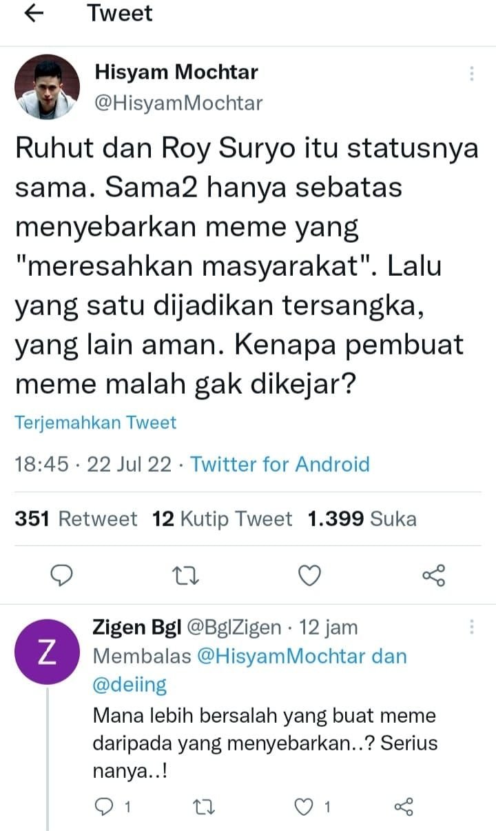 “Ruhut dan Roy Suryo itu statusnya sama. Sama-sama hanya sebatas menyebarkan meme yang “meresahkan masyarakat”,” tulis akun tersebut dikutip Bantenraya.com, Sabtu 23 Juli 2022.