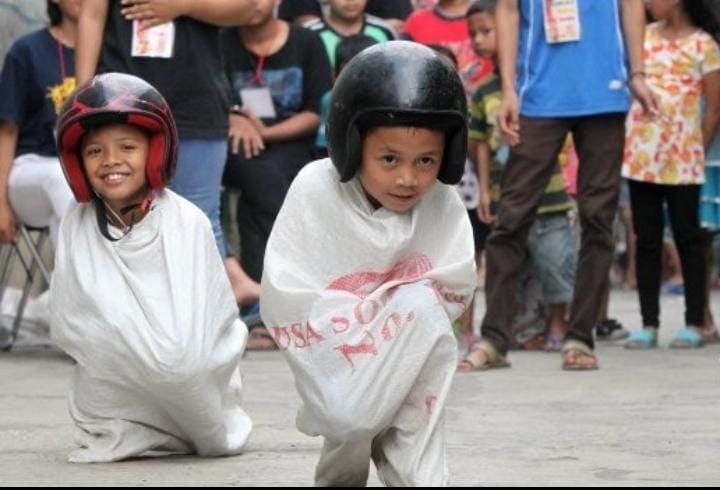 Para peserta balap karung pakai hlem didomisili oleh anak-anak agar lucu ditontonnya, dan dimana para peserta tersebut harus mengikuti peraturan hingga finish dari garis strat perlombaan.
