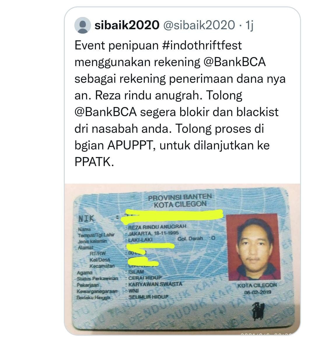 Tak hanya itu, kartu identitas ketua panitia Indothrift Fest tersebut juga diunggah di media sosial yang diketahui merupakan berdomisili di Cilegon seperti yang diunggah dari akun Twitter @sibaik2020.