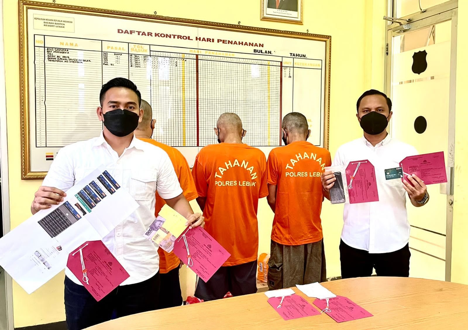 DJ(35), RH (52) dan LR(63) dan sejumlah barang bukti antara lain satu unit handphone Samsung, uang tunai Rp 70 ribu,dua lembar bukti dopiste, dua lembar kertas pasangan angka dan satu buku tabungan ATM Bank BNI atas nama pelaku DJ.