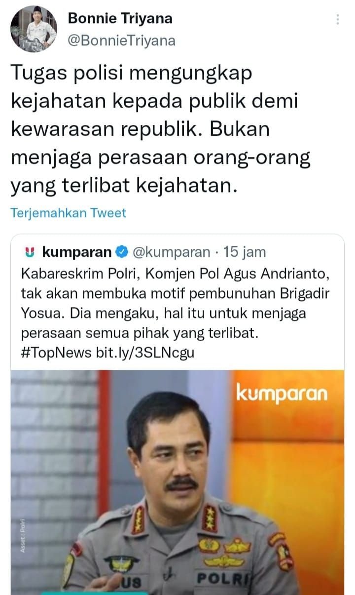 Bonnie melalui akun twitternya @BonnieTriyana menyoroti pernyataan Komjen Pol Agus Andrianto yang tidak akan membuka motif pembunuhan Brigadir Yosua karena alasan menjaga perasaan semua pihak yang terlibat.