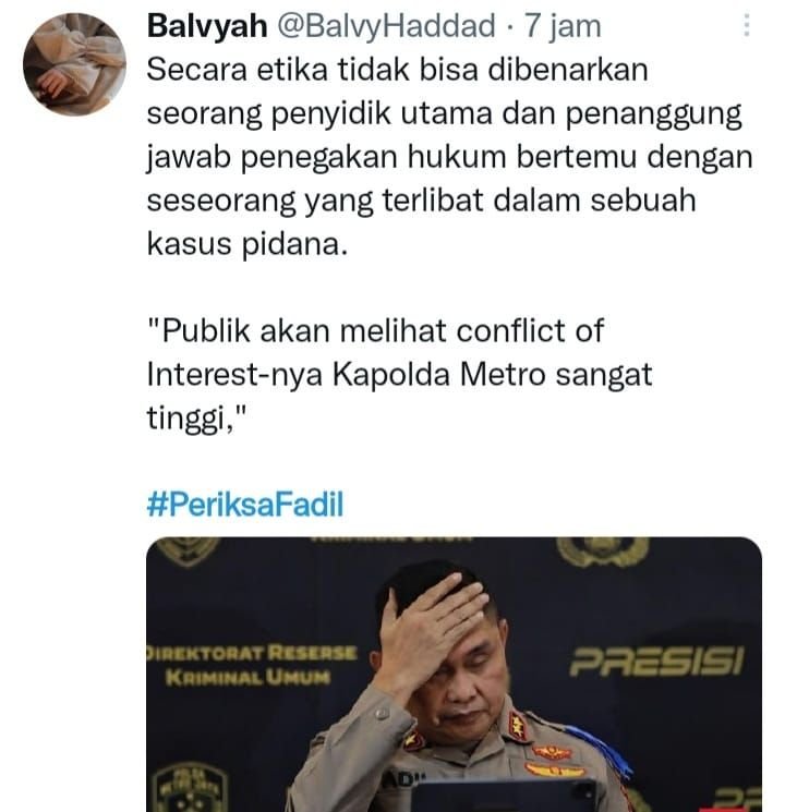 Ia juga menuliskan, pertemuan kedua polisi itu menyebabkan publik akan melihat conflict of interest-nya Kapolda Metro sangat tinggi. “#PeriksaFadil,” katanya.