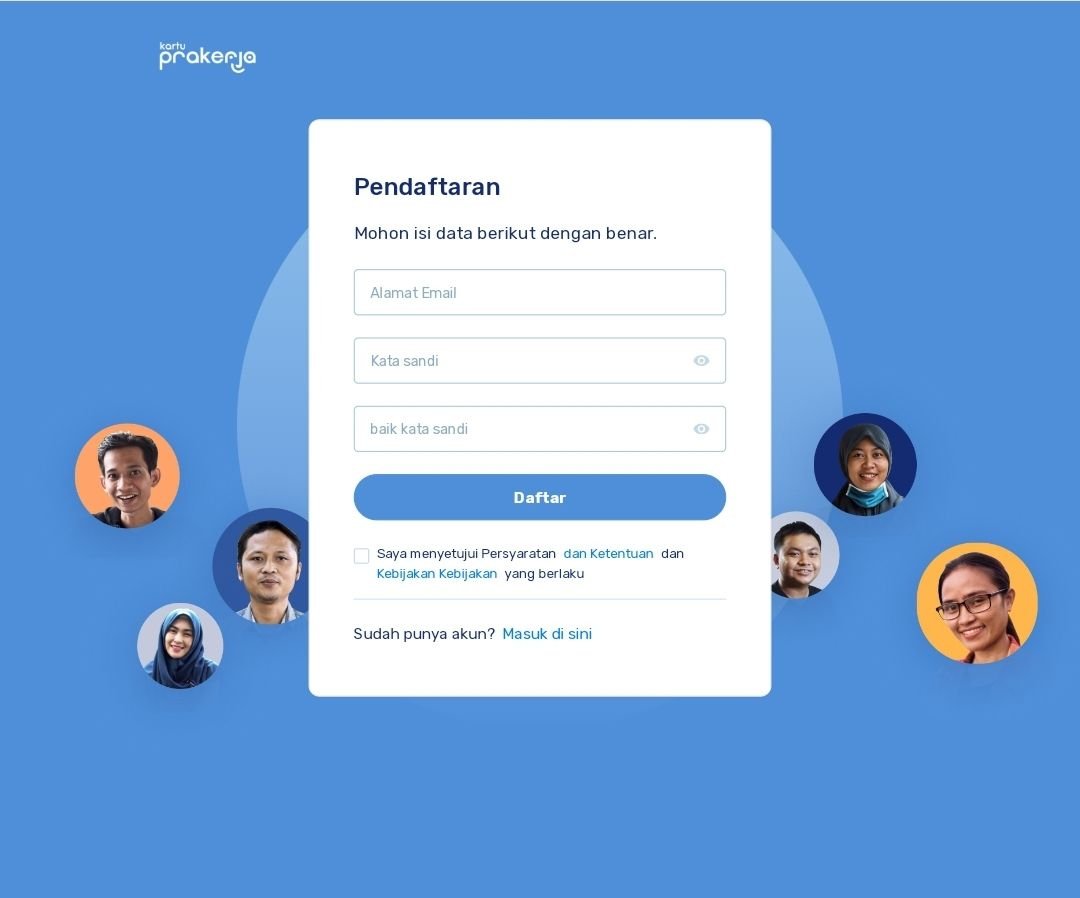 Dengan membuka laman web www.prakerja.go.id, masukan Email dan password lalu klik daftar.