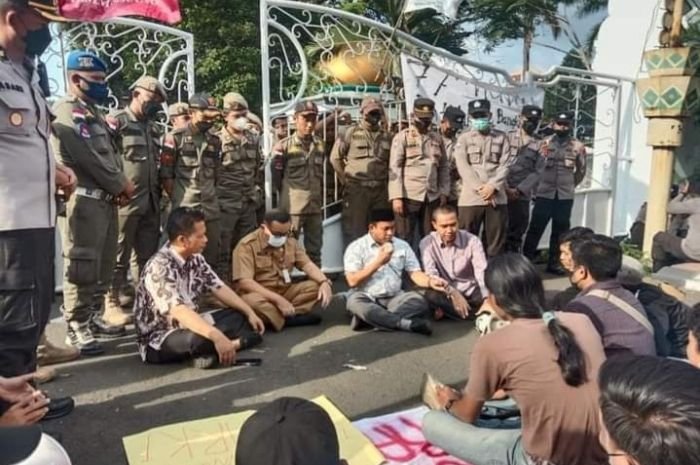 Fraksi PKS DPRD Kabupaten Serang menemui peserta aksi yang menuntut pembatalan kenaikan harga BBM, Selasa 6 September 2022. Rahmat Tanjung/Bantenraya.com