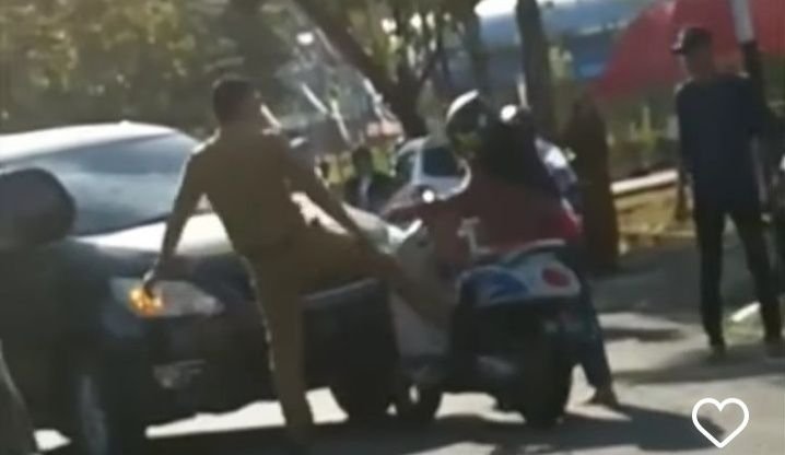 Bukannya membantu, oknum ASN itu justru menendang bagian belakang motor sesaat setelah si pemotor perempuan baru saja berhasil mendirikan kendaraannya.